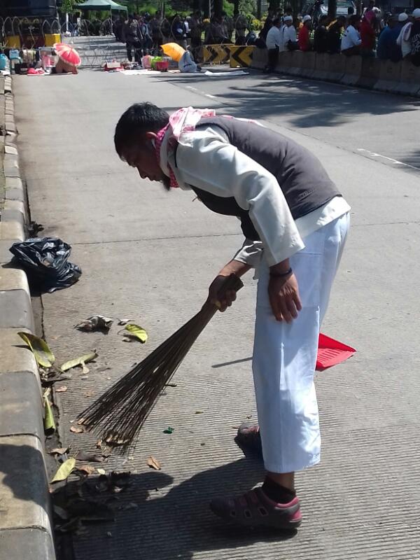 Wartapilihan.com, Jakarta – Berbeda dengan Petugas Pengelolaan Sarana dan Prasarana Umum (PPSU) yang akrab disapa Pasukan Oranye dengan gaji 3,3 juta per bulan, seorang pemuda paruh baya asal Jawa Barat, Bagas (34) aktivis Aliansi Pembela Islam Jawa Barat (API Jabar) membersihkan area depan Kementerian Pertanian, Ragunan, Jakarta Selatan. Ia rela membersihkan sampaj di area demo tanpa bayaran.