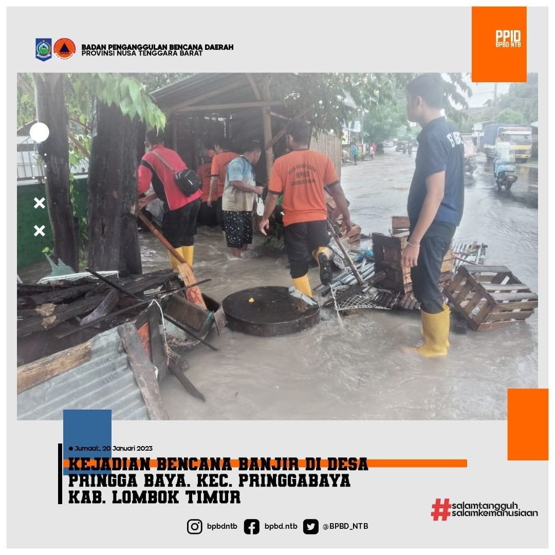 Terjadi hujan lebat di wilayah Kabupaten Lombok timur dan sekitarnya pada hari Jumaat, 20 Januari 2023 pukul 13.30 WITA sehingga mengakibatkan luapan air meningkat hingga menyebabkan banjir di Dusun Pringgabaya Desa Pringgabaya Kec. Pringgabaya Kab. Lombok Timur.