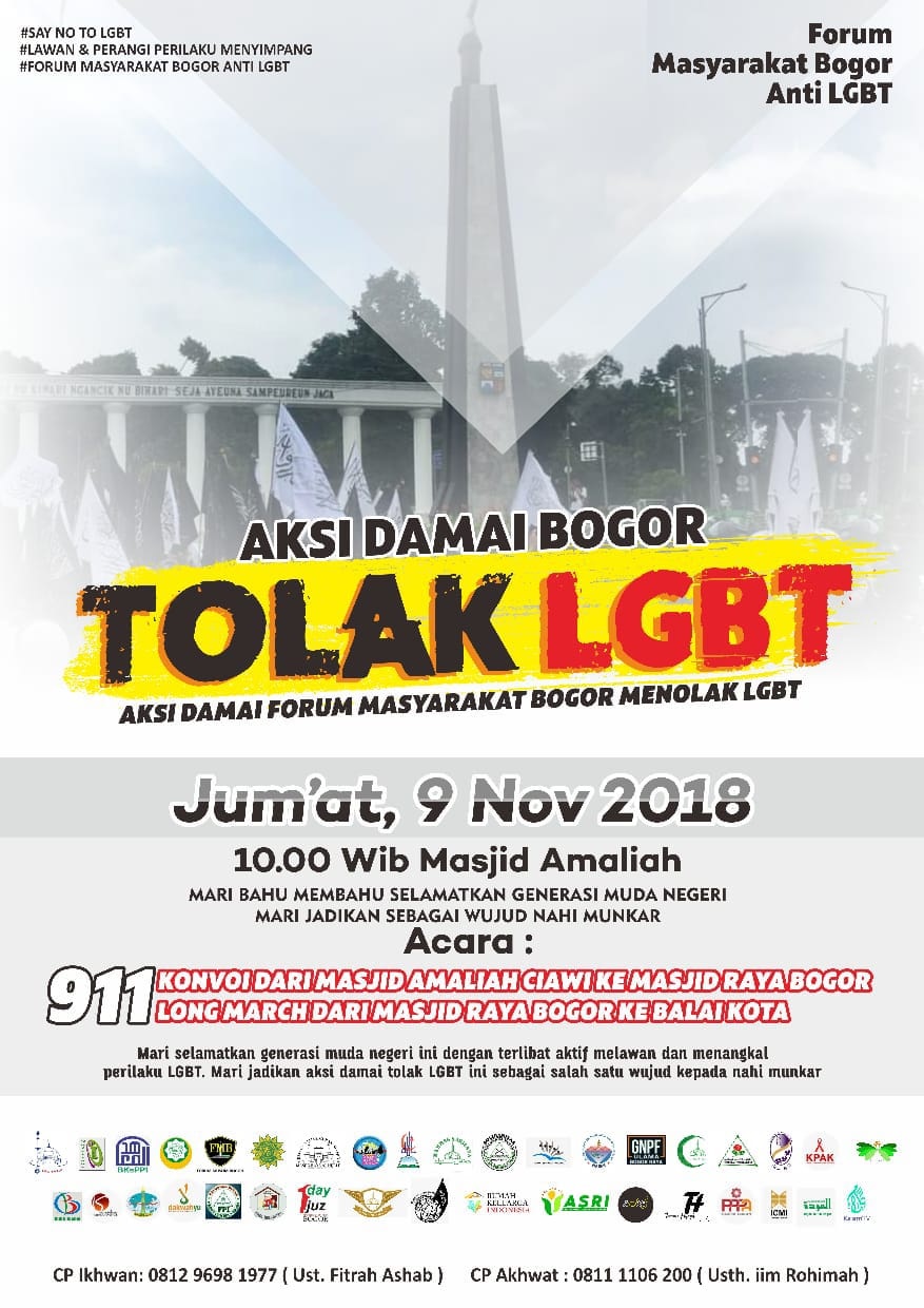 Wartapilihan.com, Bogor – Berbagai organisasi massa yang tergabung dalam Forum Masyarakat Bogor Anti LGBT akan menggelar Aksi Tolak LGBT (Lesbian Gay Biseks Transgender) di Kota Bogor pada Jumat (9/11).