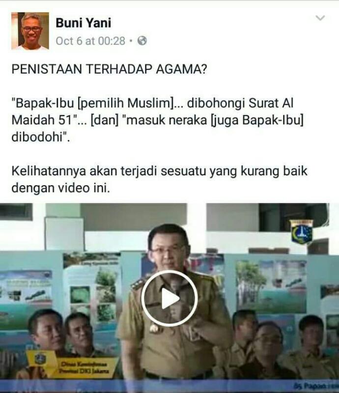 Buni Yani menjadi tersangka dan dijerat Pasal 28 ayat 2 UU Nomor 11 Tahun 2008 tentang ITE karena dituduh memposting status bermuatan SARA melalui akun media social (facebook). |