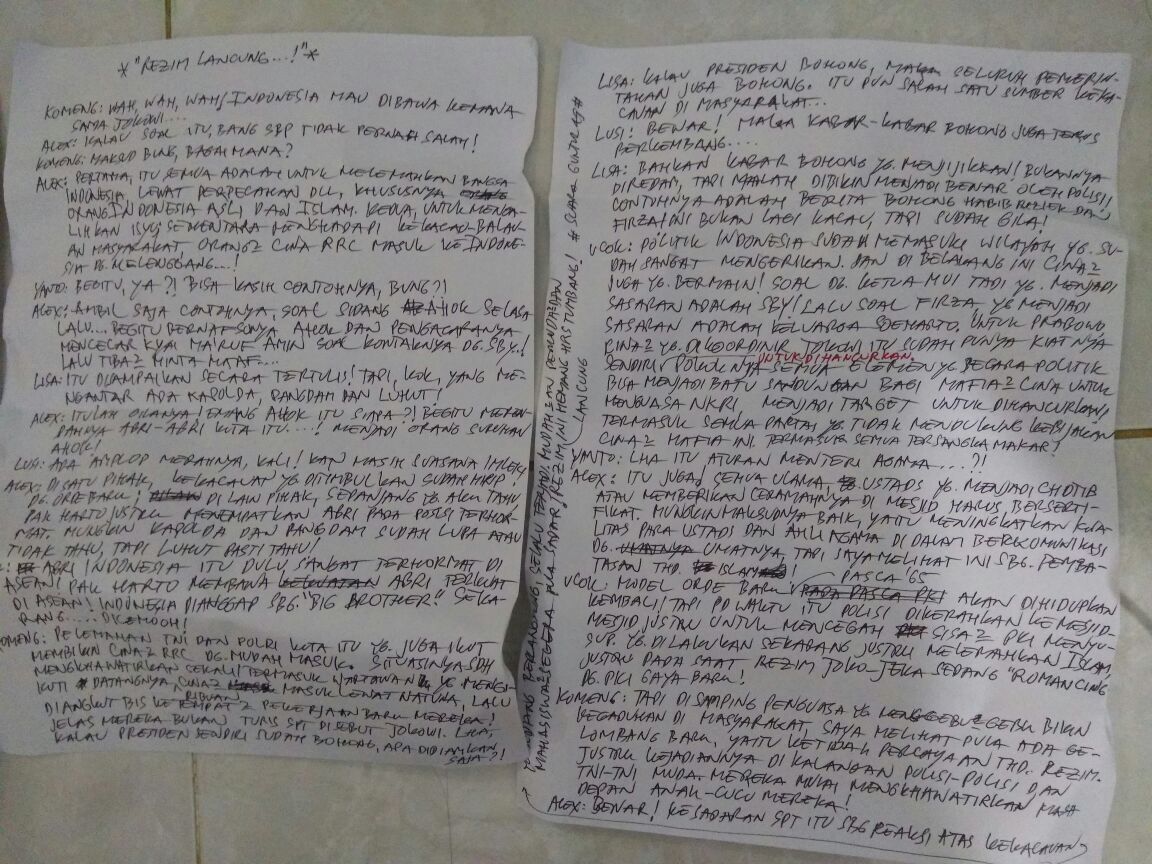 Ucok : Politik Indonesia sudah memsuki wilayah yang sangat mengerikan dan di belakang ini Cina-Cina juga yang bermain ! Soal dengan Ketua MUI tadi yang menjadi sasaran adalah SBY! Lalu soal Firza yang menjadi sasaran adalah SBY! Lalu soal Firza yang menjadi sasaran adalah keluarga Soeharto. Untuk Prabowo Cina-Cina yang dikoordinir Jokowi itu sudah punya kiatnya sendiri untuk dihancurkan. Pokoknya semua elemen secara politik bisa menjadi batu sandungan bagi mafia-mafia Cina untuk menguasai NKRI, menjadi target untuk dihancurkan termasuk semua partai yang mendukung kebijakan Cina-Cina mafia ini. Termasuk semua tersangka makar !