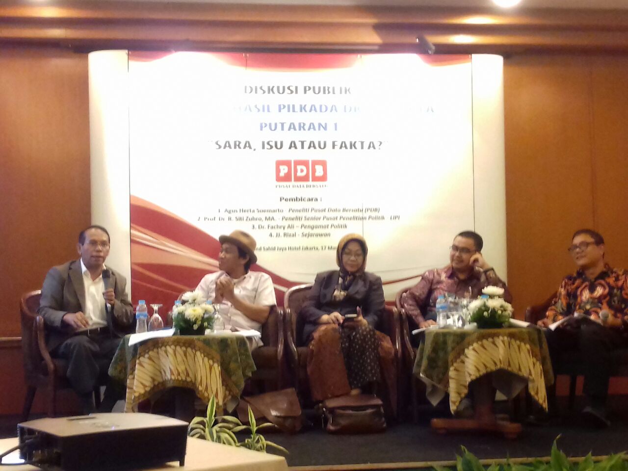 Secara faktual, SARA bukan hanya sekedar isu. Pilkada DKI Putaran I terindikasi kuat melibatkan isu SARA. “Terbukti di wilayah yang mayoritas pemilihnya Non Muslim, Ahok menang telak, di wilayah yang mayoritas pemilihnya Non Muslim, tidak ada pemenang telak, Ahok masih mendapatkan suara yang signifikan. Yang paling efektif memanfaatkan isu SARA adalah pasangan Ahok Djarot,” pungkasnya. I