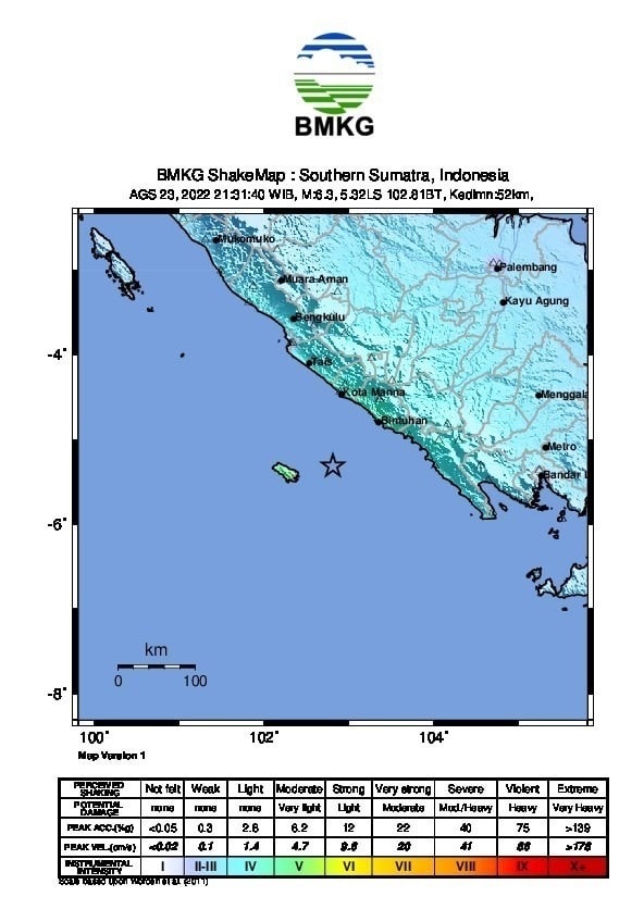 “Cukup kuat, Pak. Ini dirasakan cukup kencang di kabupaten Mukomuko, Bengkulu Selatan, Rejang Lebong, Kota Bengkulu, Bengkulu Utara,” ungkap BPBD Provinsi Bengkulu Septi.