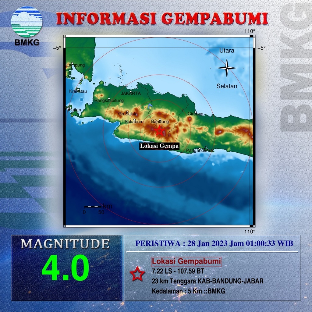 Hari Sabtu, 28 Januari 2023 pukul 01:00:33 WIB, wilayah KAB-BANDUNG-JABAR dan sekitarnya diguncang gempabumi tektonik. Hasil analisa BMKG menunjukkan bahwa gempabumi ini berkekuatan M=4,0.
