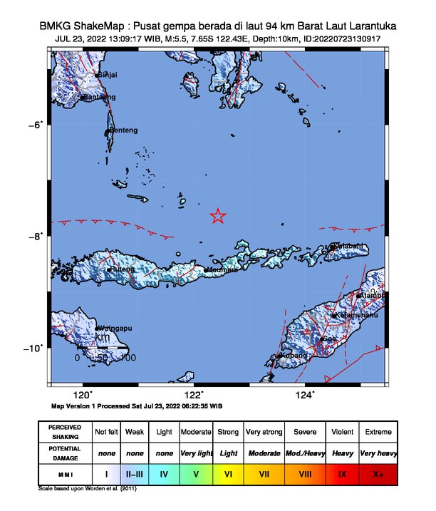 Hari Sabtu 23 Juli 2022 pukul 13.09.17 WIB wilayah Laut Flores diguncang gempa tektonik. Hasil analisis BMKG menunjukkan gempabumi ini memiliki parameter update dengan magnitudo M5,4.