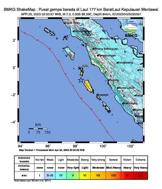Hari Selasa 25 April 2023 pukul 03.00.57 WIB wilayah pantai barat Sumatera diguncang gempa tektonik. Hasil analisis BMKG menunjukkan gempabumi ini memiliki parameter update dengan magnitudo M6.9.