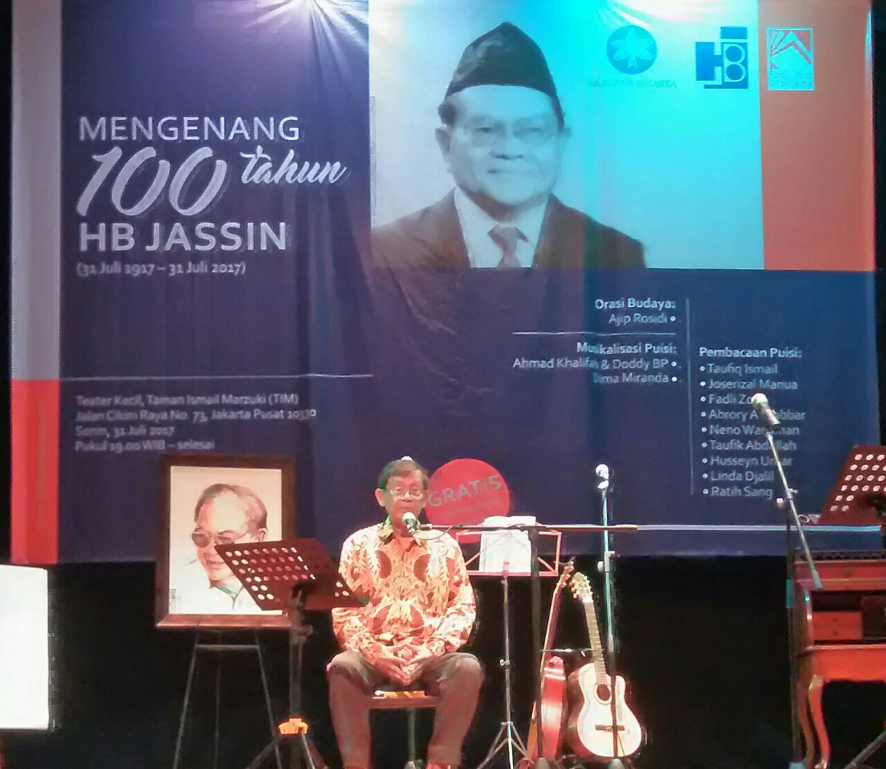 lampu kuning yang remang-remang. Hingga tersisalah layar lebar yang bukan film di depan, tetapi seorang kakek berkacamata yang tengah duduk. Ia pegang tumpukan kertas yang ia baca, sebuah orasi budaya. Ia ceritakan pengalaman hidupnya semasa HB Jassin menjadi seniornya dalam bidang sastra. Ia, menurut Ajip secara pribadi, ialah seseorang yang sangat berpengaruh dalam karir kesusasteraannya sejak dulu.