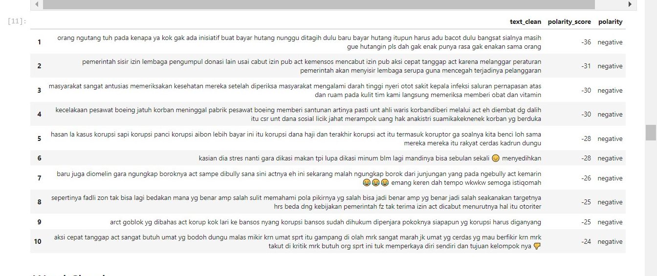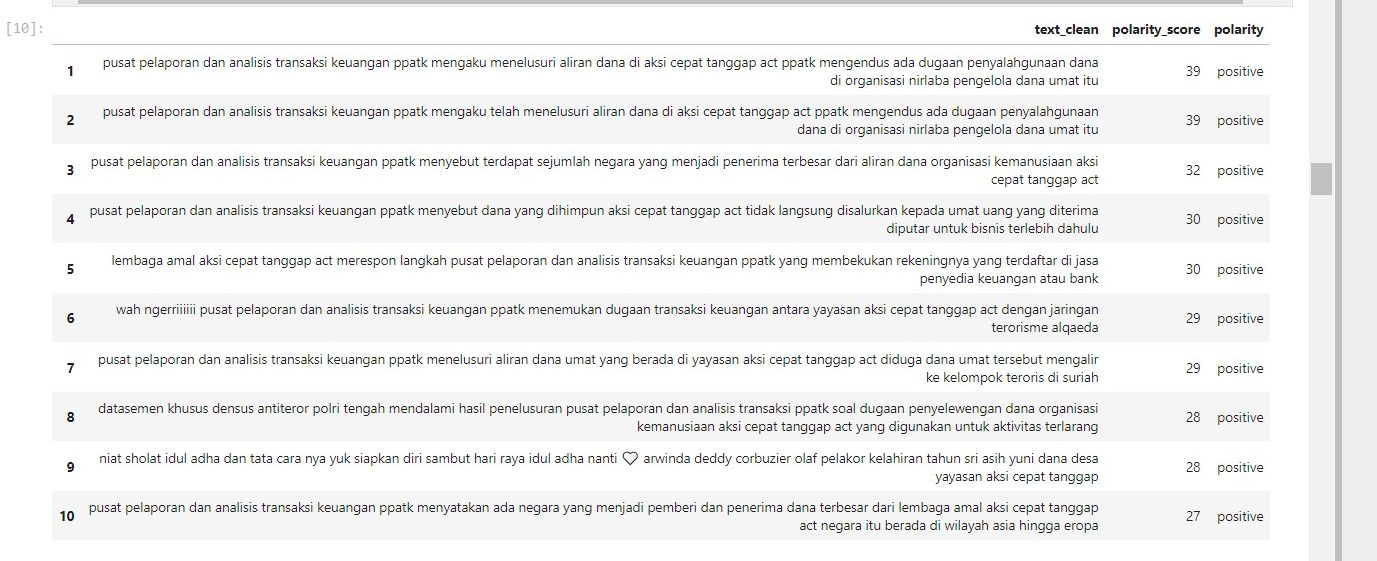Bagaimana tanggapan warga net terkait dengan kasus ACT ini, berikut ini disajikan hasil crawling data dari Twitter terkait masalah ACT. Data diambil dari tanggal 25 Juni s/d 12 Juli 2022 dengan total data yang terkumpul ada 22.836 cuitan. Dari sebaran tersebut terlihat bahwa mayoritas warga net masih berfikir positif (44.6 %). Sedangkan yang memberikan tanggapan negatif sebesar 30 % dan netral 25.4 sebagaimana terlihat pada Gambar 2. Gambaran lebih detil bisa dilihat pada Gambar 3 dan 4 yang mendesekripsikan sepuluh komentar positif dan negative teratas. Sedangkan kata apa yang paling sering diperbincangkan oleh warganet baik positif maupun negatif bisa dilihat pada Gambar 5. Dari sana terlihat bahwa kata-kata positif yang sering diperbincangkan adalah ACT identik dengan aksi, tanggap, dana, dana umat dan presiden ACT. Sedangkan kata-kata negatif yang sering diperbicangkan terkait kasus ACT adalah ACT lembaga yang banyak melakukan penyelewengan sehingga layak dicabut ijinnya.