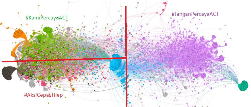 Untuk mendapatkan gambaran lebih jauh terkait dengan ACT ini, bisa dilihat pada peta SNA (Social Network Analyzer) sebagaimana terlihat pada Gambar 6. Dari gambar tersebut terlihat ‘pertempuran’ yang nyata antara tagar #AksiCepatTilep dengan #KamiPercayaACT. Para pengusung tagar #KamiPercayaACT yang dimotori oleh akun PanciB0zz, maspiyuaja berharap tidak terjadi framing negatif atas kasus ACT ini. Sebaliknya, pengusung #AksiCepatTilep yang diantaranya dimotori oleh akun cybsquad_ banyak mengungkapkan kekesalan mereka atas apa yang dilakukan petinggi ACT dan parpol tertentu. Sedangkan pengusung tagar #JanganPercayaACT yang antara lain dimotori oleh akun AnakKolong banyak mengungkapkan ketidakadilan penggajian yang terjadi di ACT.