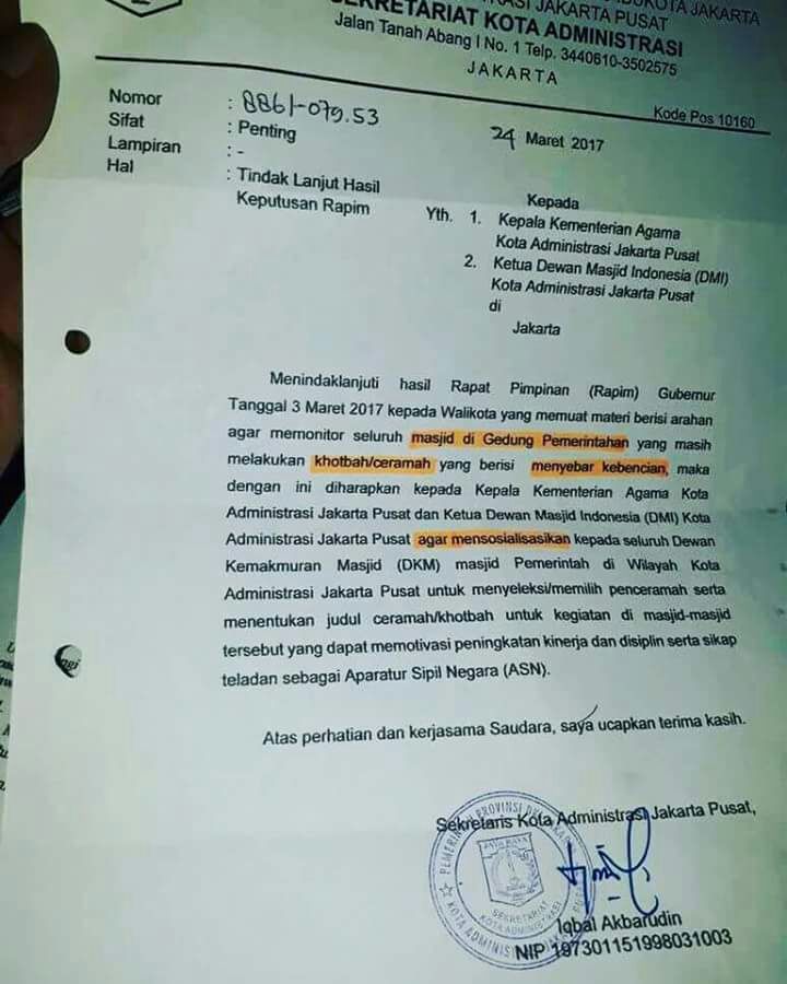 Wartapilihan.com, Jakarta – Surat hasil Rapat Pimpinan (Rapim) Gubernur tanggal 3 Maret 2017 kepada Walikota yang menyerukan agar memonitor seluruh masjid di Instansi Pemerintahan yang bernuansa menyebarkan agitasi dan propaganda, dipertanyakan. Hal ini merupakan intervensi pemerintah yang kebablasan terhadap khatib/da’i yang memberikan pemahaman agama kepada masyarakat. Demikian kata Ustadz Buchory Muslim saat dihubungi Warta Pilihan pada Ahad (2/4).