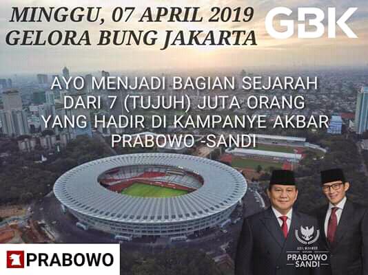 Wartapilihan.com, Jakarta — Pasangan Calon Presiden dan Wakil Presiden nomor 02, Prabowo Subianto-Sandiaga Uno akan menggelar kampanye akbar di Stadion Utama Gelora Bung Karno (SUGBK), Ahad 7 April 2019.