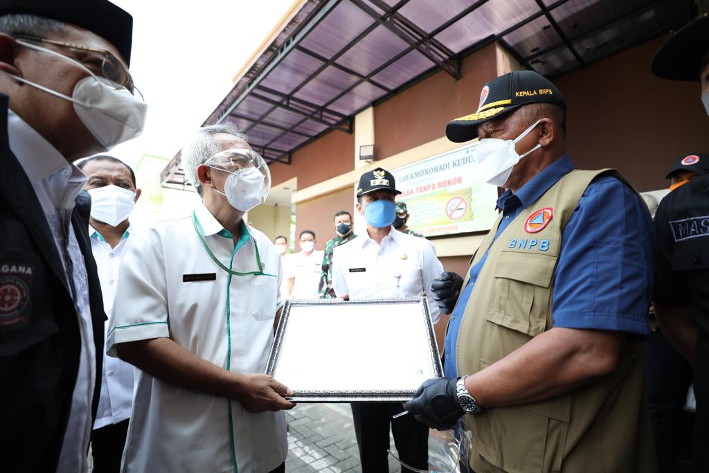 Pada kesempatan tersebut, Ketua Satgas menyerahkan dukungan penanganan COVID-19 secara simbolis kepada Pemerintah Kabupaten Kudus berupa tenda isolasi sebanyak 2 buah, masker kain 20 ribu, masker kain anak 10 ribu dan handsanitizer sebanyak 20 jerigen masing-masih 4 liter.