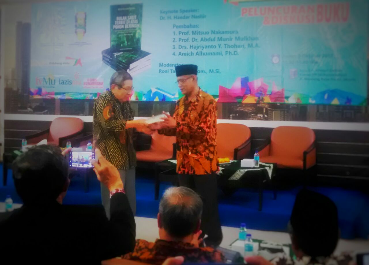 Haedar Nasir (kanan) secara simbolis menyerahkan buku karya Professor Nakamura mengenai sejarah dan masa depan Muhammadiyah. Foto: Zuhdi
