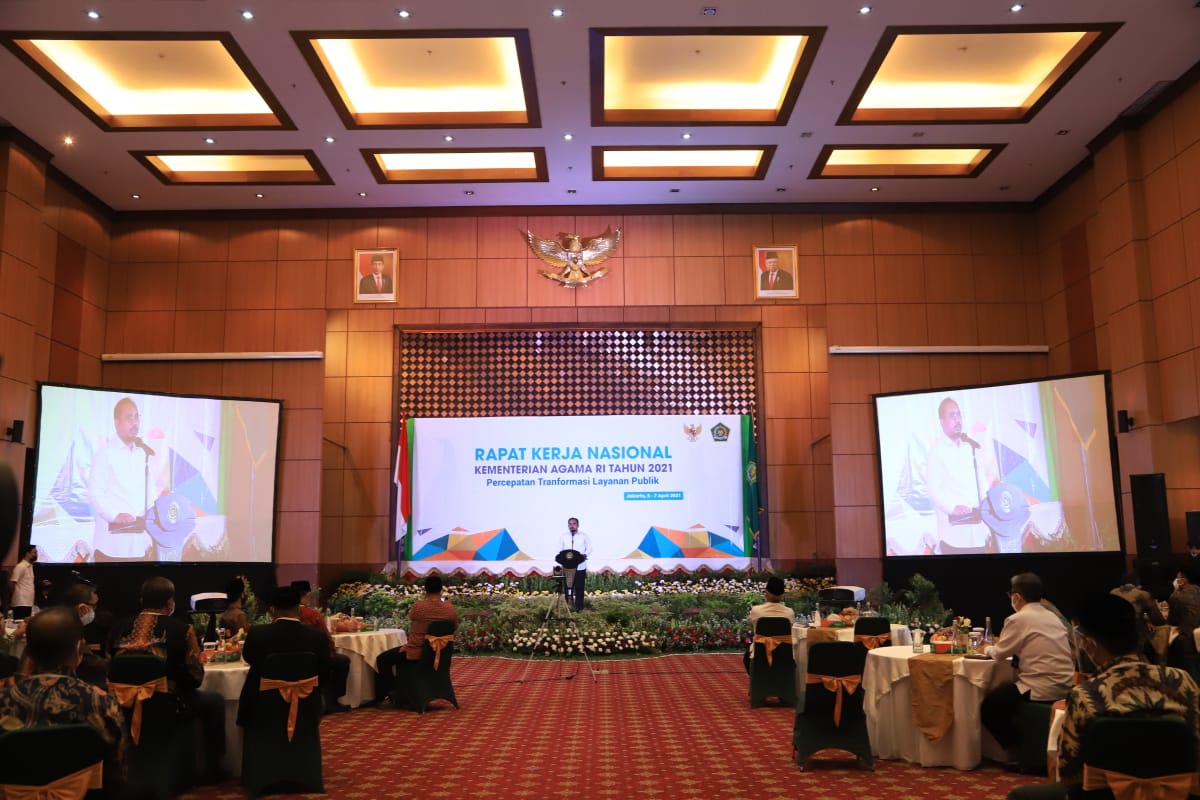 Kementerian Agama (Kemenag) menggelar Rapat Kerja Nasional (Rakernas) 2021. Kegiatan yang mengangkat tema Percepatan Transformasi Layanan Publik ini digelar secara luring dan daring, mulai Senin-Rabu (5 – 7 April 2021).