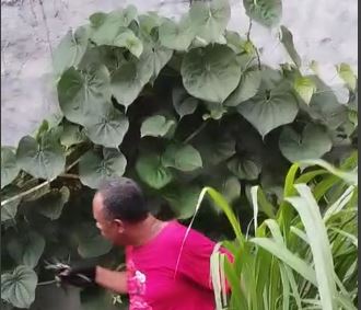 “Ini tanaman kentang air,” kataku sambil menunjukkan salah satu tanaman paling unik di koleksi kami. Potato air, atau kentang gantung, merambat di tali yang senagaja kami pasang, buahnya bergelantungan rapi di ketiak daun. Saya petik beberapa buah dan memberikannya kepada Pak Bambang.