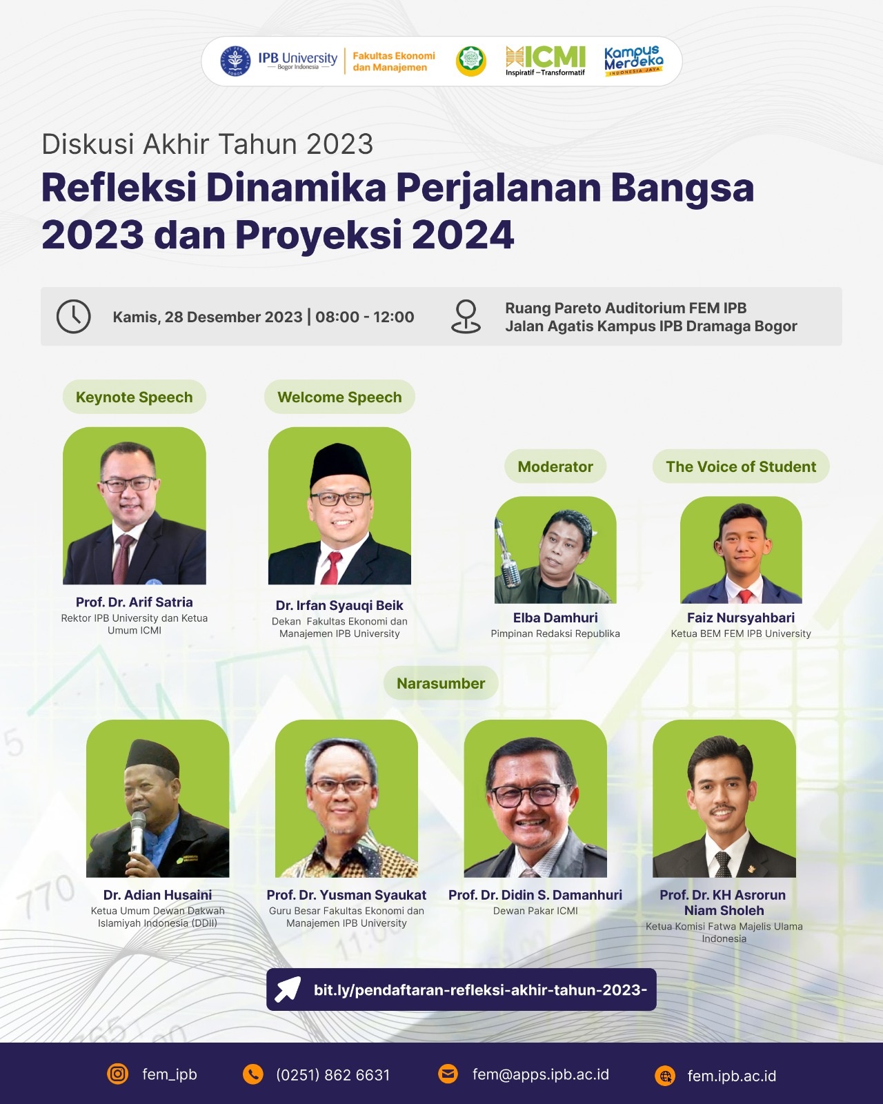 Pada 28 Desember 2023, saya mendapat kehormatan untuk berbicara dalam acara diskusi akhir tahun di Kampus IPB University, Dramaga, Bogor. Acara digelar oleh Fakultas Ekonomi dan Manajemen (FEM) IPB University, bekerjasama dengan Ikatan Cendekiawan Muslim se-Indonesia (ICMI) dan Majelis Pakar Dewan Da’wah Islamiyah Indonesia (DDII).