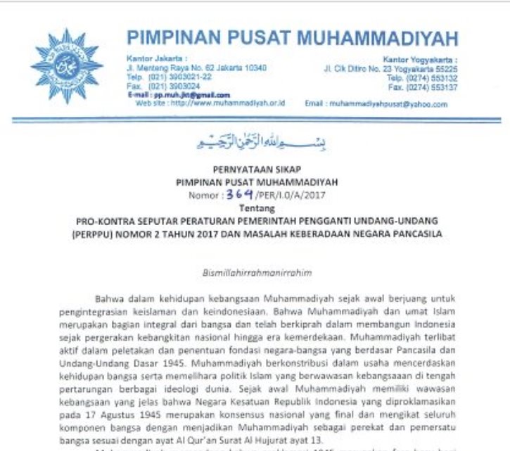 Muhammadiyah memandang diperlukan tindakan hukum terhadap organisasi kemasyarakatan yang terbukti secara nyata dan meyakinkan mengembangkan paham, ideologi dan gerakan yang bertentangan serta ingin mengganti Pancasila atau keberadaan NKRI.