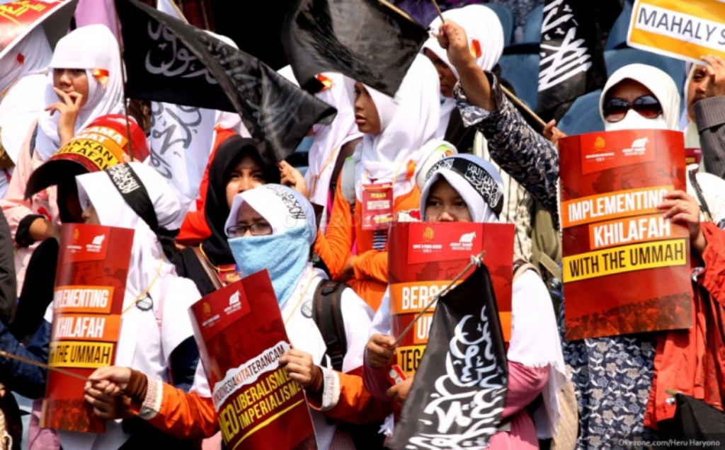 Kata-kata Khilafah Islamiyah adalah trade mark HTI di dalam kitabnya, tulisan-tulisan dan demo yang dilakukannya. Meski demikian, HTI tidak pernah menyatakan mereka memusuhi NKRI atau Pancasila. Bahkan kalau dicermati ormas HTI ini sesuai dengan sila pertama Pancasila Ketuhanan Yang Maha Esa. Sila ini bisa dimaknai bahwa kalimat bendera Laa ilaaha illallah yang dibawa HTI sesuai dengan sila pertama dan kalimat ini juga digunakan oleh para pejuang Islam dalam memerdekakan Indonesia dari penjajahan bangsa asing.
