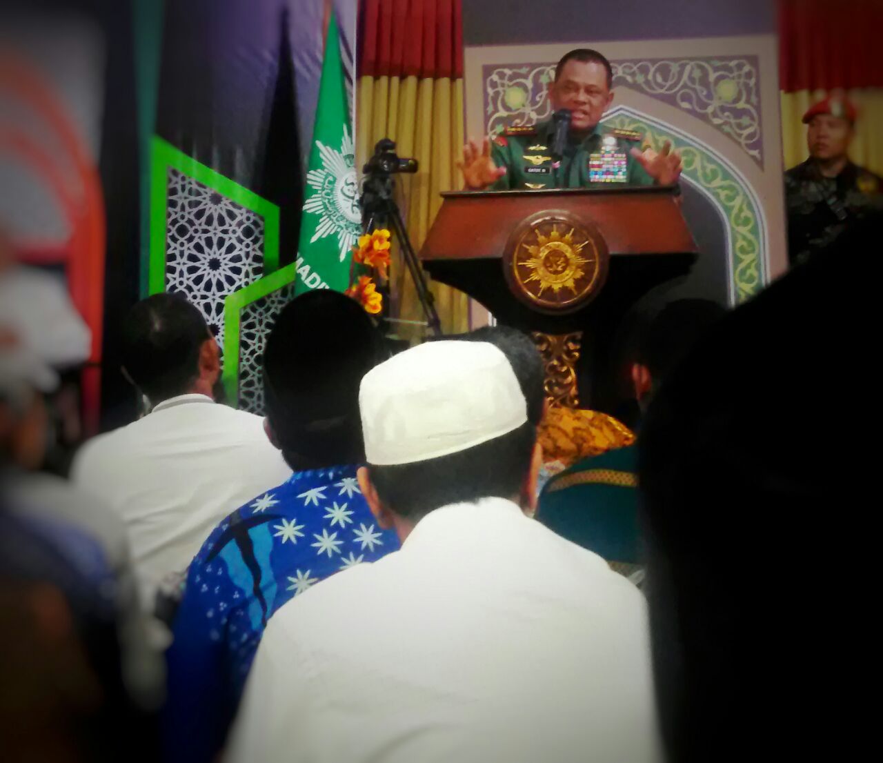 “Kita harus sadar tinggal di suatu negara yang kaya, sedangkan orang lain dalam keadaan kekurangan. Arab Spring ujung-ujungnya adalah minyak. ISIS, bohong. Ujung-ujungnya imperialisme. Sekarang minyak sudah habis, tinggal nabati (energi hayati), dan nabati ada di Indonesia. Banyak celah-celah merebut bangsa ini, tetapi selama umat Islam bersatu, hal itu sulit dilakukan,” tegas Panglima.