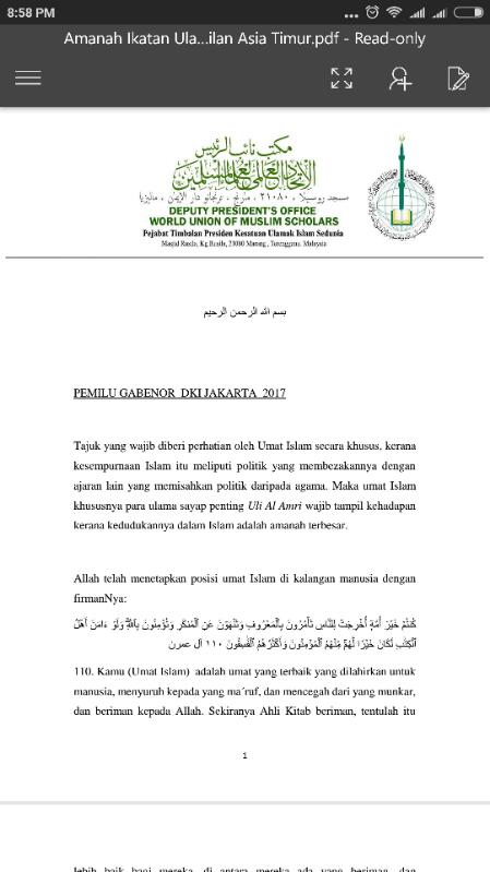 “Jabatan gubernur adalah Wilayah ‘Ammah yang mensyaratwajibkan Islam, ‘Adalah (adil/tidak fasik) serta melindungi realitas penduduk terbesar,”papar pernyataan para Ulama dalam Bahasa Melayu ini.