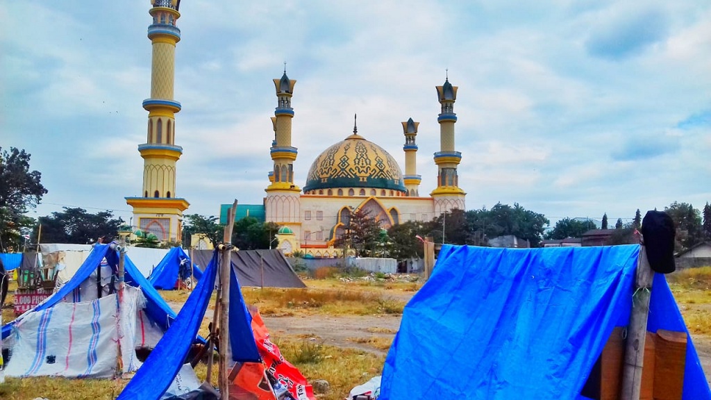 Tempat pengungsian sementara warga Kota Mataram di sebelah Masjid Hubul Wathan Islamic Center, Lombok, Nusa Tenggara Barat. Foto: Zuhdi.