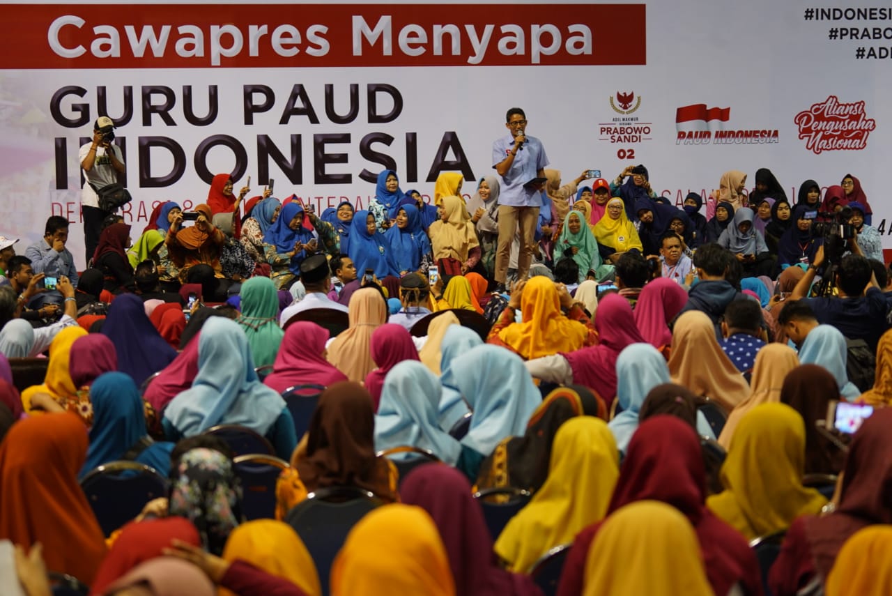 Wartapilihan.com, Surabaya — Sandiaga Salahudin Uno, berjanji akan meningkatkan kesejahtraan guru Pendidikan Anak Usia Dini (Paud) jika dia terpilih menjadi wakil presiden mendampingi capres Prabowo Subianto.