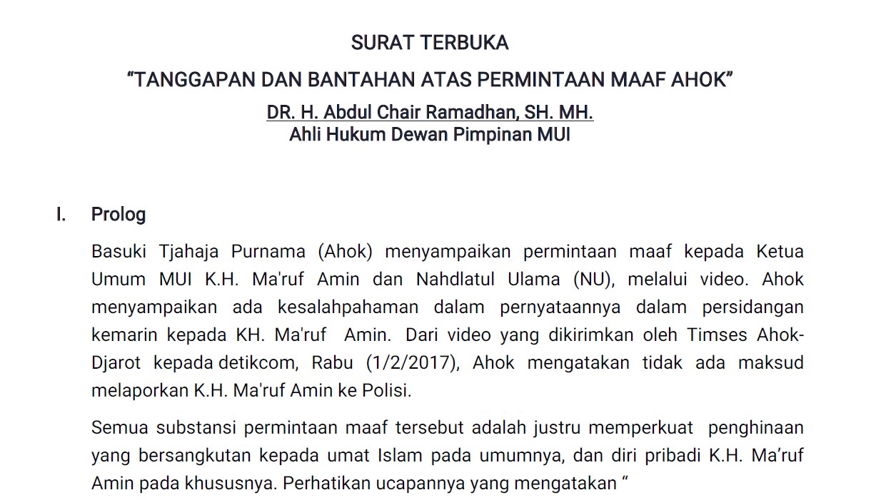 - Majelis Ulama Indonesia sebagai pihak yang berkepentingan memiliki hak untuk melakukan serangkaian upaya hukum terhadap Penasehat Hukum Ahok dan termasuk Ahok yang telah menciptakan situasi tidak kondusif di masyarakat. Kepada mereka harus dilaporkan kepada pihak yang berwajib sesuai dengan ketentuan hukum pidana.