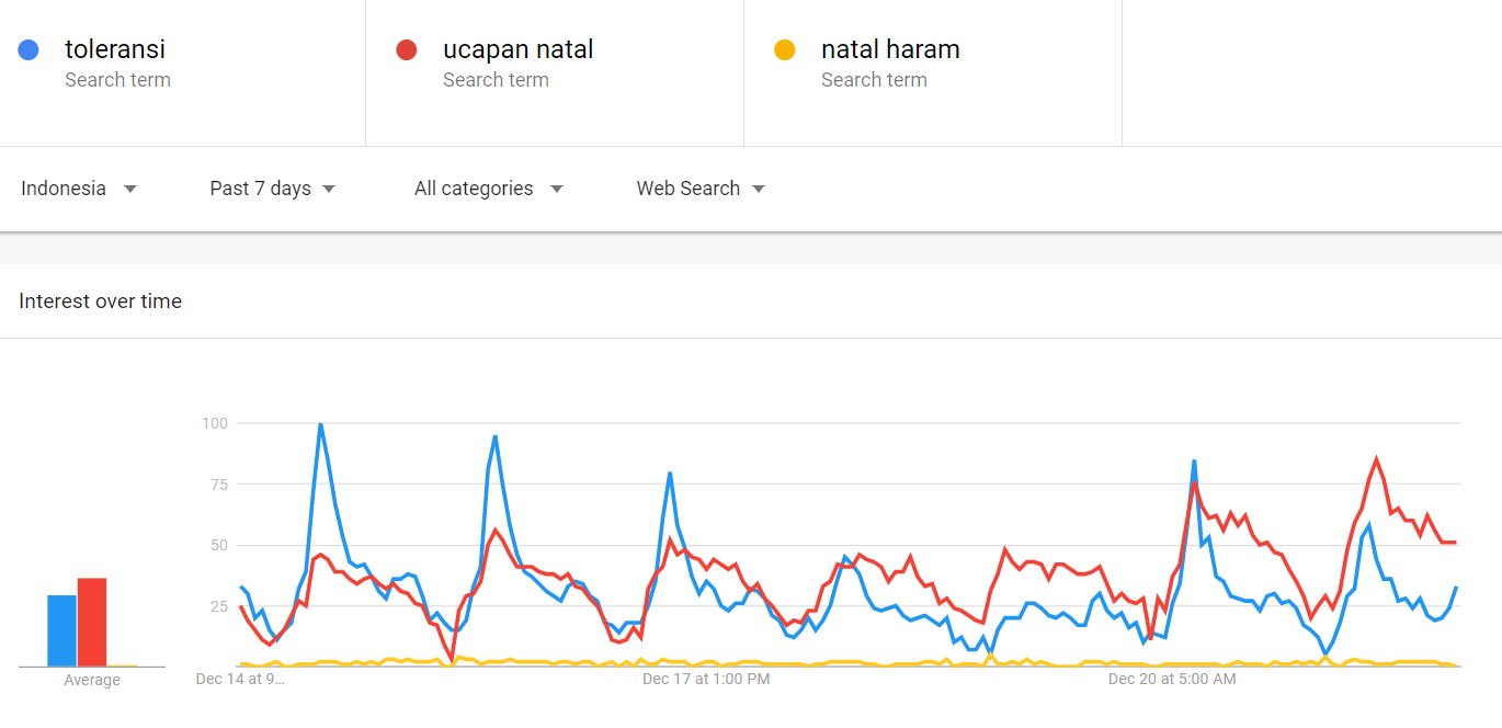 Lalu bagaimana situasi menjelang akhir tahun ini? Apakah situasinya masih sama seperti tahun-tahun sebelumnya dimana selalu terjadi kegaduhan seputar masalah toleransi dan ucapan natal? Untuk menguak fenomena tersebut, berikut ini sedikit dikupas situasi 7 hari kemarin (14-21 Des 2021) yang diambil dari pemberitaan online media mainstream. Ternyata pemberitaan tentang toleransi dan ucapan natal masih cukup marak sebagaimana terlihat pada gambar di bawah ini. Hanya saja media online masih cukup menjaga suasana dengan minimnya pemberitaan tentang natal haram.