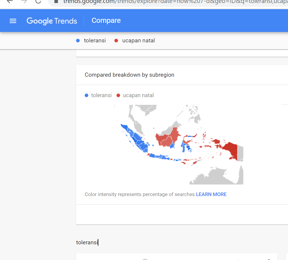 Terkait dengan sebaran topik, pemberitaan tentang toleransi lebih banyak terjadi di Jawa, Sumatera dan sebagian besar Sulawesi. Sementara pemberitaan tentang ucapan natal lebih tersebar merata di Kalimantan dan Irian Jaya. Bisa jadi kondisi ini terjadi karena banyaknya warga yang saling mengucapkan selamat natal di wilayah tersebut.