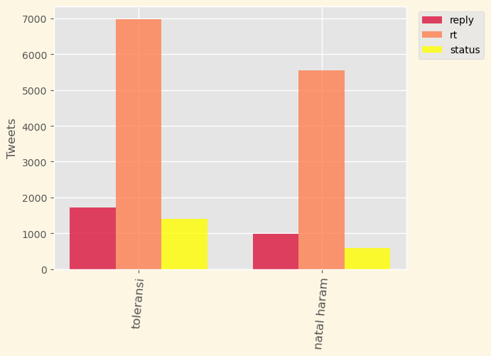 Dari gambar diatas terlihat bahwa pembicaraan seputar toleransi dan natal haram didominasi oleh Retweet dibandingkan dengan status asli mereka. Artinya jagat Twitter lebih banyak dipenuhi oleh Retweet status orang lain, meski ada juga yang menanggapi hasil cuitan.