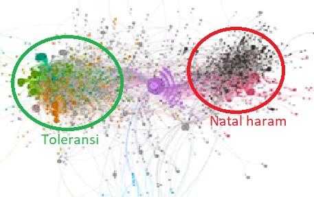 Berikutnya, untuk menunjukkan peta ‘perseteruan’ para pihak terkait dengan topik diatas, berikut ini ditampilkan peta SNA (Social Network Analyzer) nya. Dari peta SNA terlihat bahwa jarak kedua cluster ini telatif jauh. Hal ini menunjukkan tidak ada ‘perseteruan’ yang nyata diantara kedua cluster. Hanya saja memang ada beberapa pihak yang mencoba memanas-manasi suasana agar kedua cluster ini bisa mendekat agar suasana menjadi panas. Hal ini tercemin dari misalnya tantangan Permadi Arya alias Abu Janda untuk menunjukkan ayat ataupun hadits tentang larangan ucapkan selamat natal.